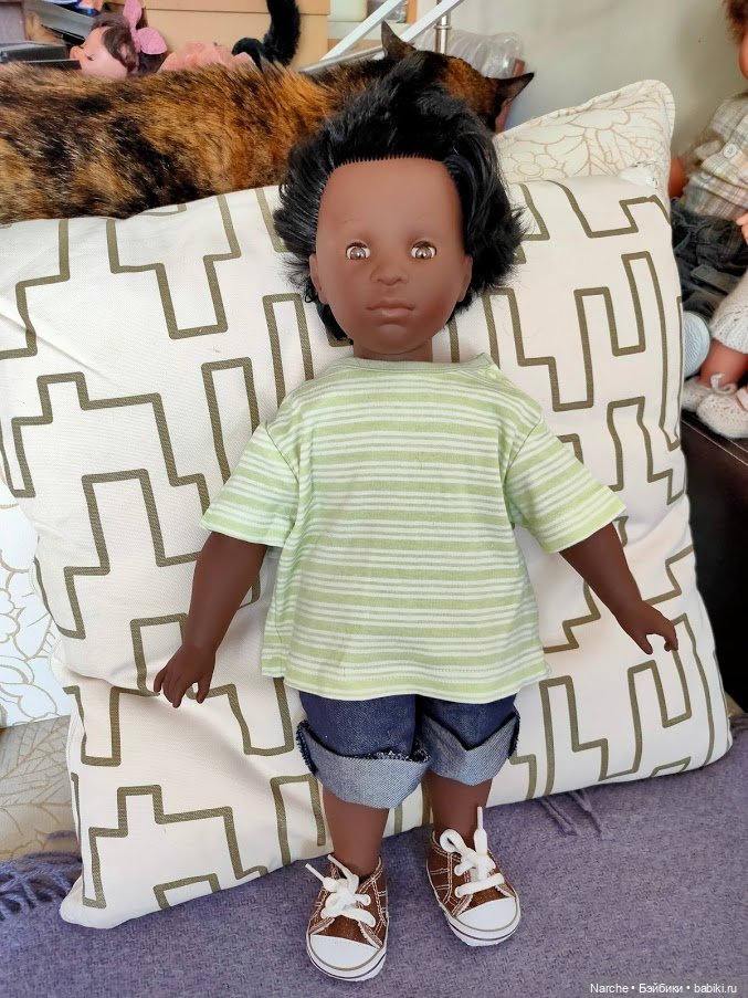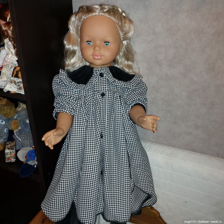 Но тут я вспомнила, что у меня имеется большая немецкая кукла, которой неплохо было бы подобрать гардероб, да и вообще руки до нее почти не дошли. В общем, начала я перебирать детские вещички и почти сразу же наткнулась на это платье. Не менее мятое, чем все остальные, но абсолютно новое, судя по маркировке, на ребенка 62 см. А моя красотуля — 70! Кончно же, платье я купила, всего за 120 р. Дома примерили — село как родное. Постираю, отглажу — и будет кукла красавицей.