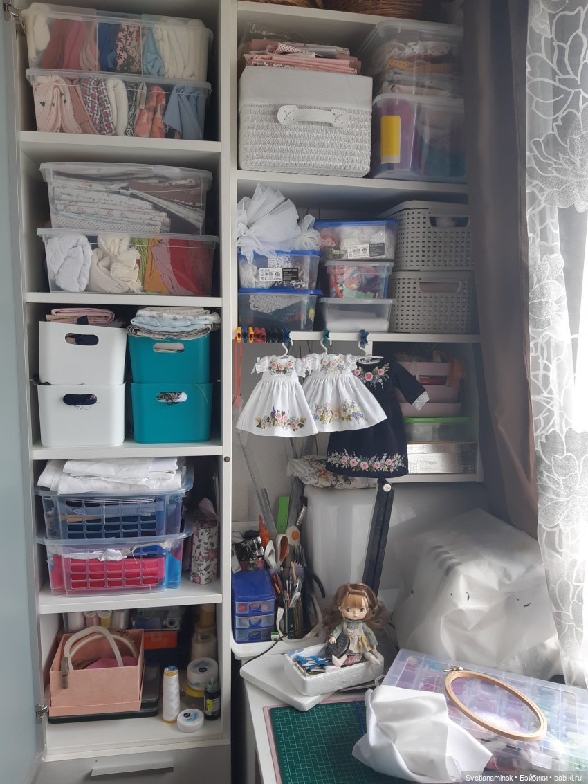 Хлопок, синтетика, меха, трикотаж, фатин заполняли коробки, ящики, полочки. И обрезки тоже жалко выбросить- вдруг тюкнет бохо- брошь сделать… так под кроватью собралось несколько коробок от сапог. Вроде отсортировано… но похоронено там же…