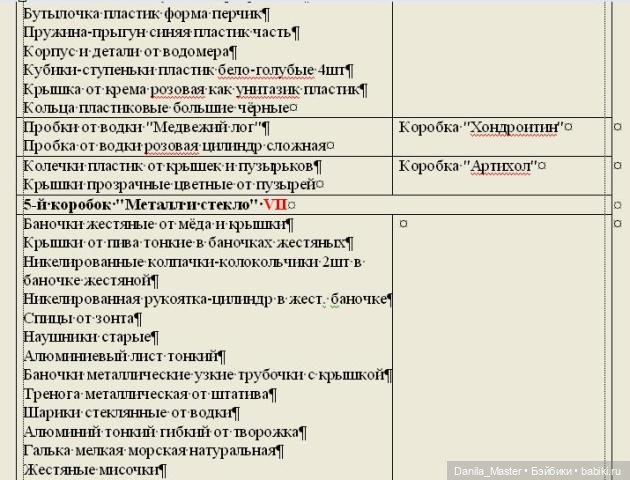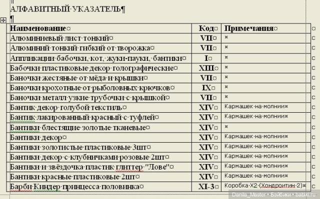 А потом ещё всё то же самое, но по алфавиту — теперь все предметы не по коробкам, а по алфавиту, напротив названия предмета — номер «главного» коробка и в примечаниях — в каком мелком коробочке или боксе предмет лежит в этом самом «главном коробке))