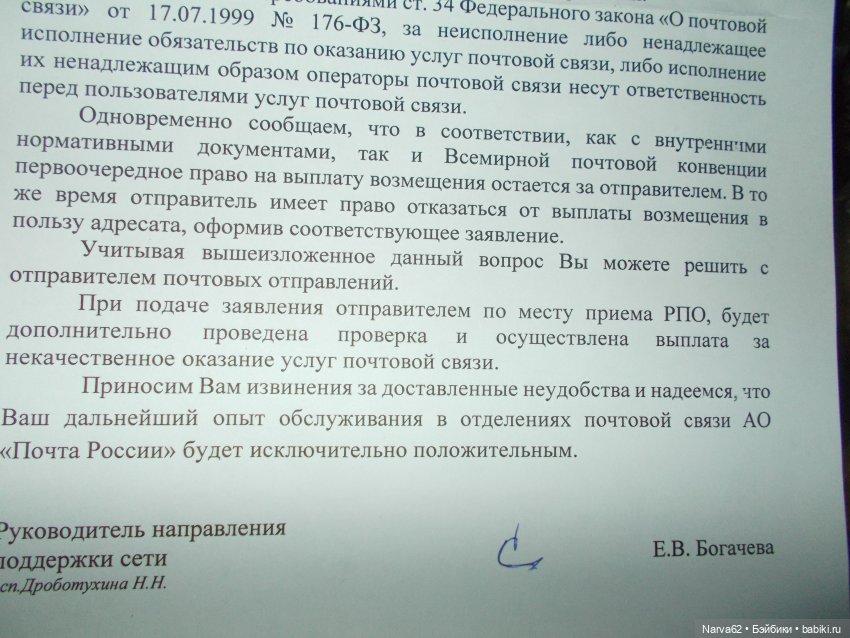 А отправителю в то же время отписывали, что отправление потерялось уже по моему адресу. просто не отметили в компьютере. Вот такие отписки.