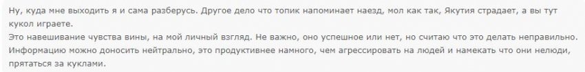 Тем не менее, вам, наверное, очень скучно, потому что вы пришли с одной целью, а потом как-то очень быстро переключились на ерунду и разборки, кто что сказал. Если бы я допускала орфографические ошибки, это совершенно точно стало бы предметом дискуссии. А меж тем напоминаю: если вы слишком эмоционально реагируете, пожалейте себя и просто избегайте неприятных новостей. Это буквально всё, что я хотела вам сказать и говорю до сих пор. У вас очень гиперболизированное видение ЛЮБОЙ ситуации. Я помню ваши топики, здесь их обсуждать не собираюсь, но почерк у вас своеобразный, и из раза в раз вам дают одни и те же советы. Прислушайтесь.