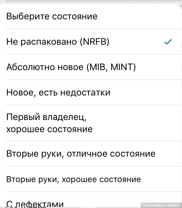 Опять же, — есть чёткое определение! Продавец не указал NRFB, как я понимаю? Дальше идет состояние Mint. Это когда куклу могли доставать, но по ее состоянию — она новая абсолютно, дефектов не обнаружено.