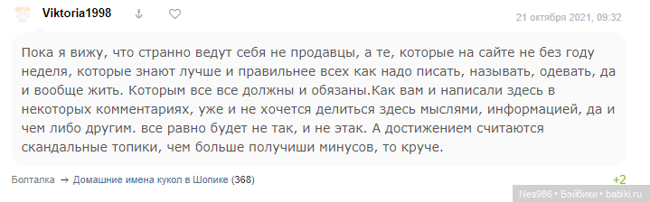 И ещё пару копеек вставлю. Продавец всё-таки среагировала чуток болезненно, но и покупатель комментарий написала не вполне вежливый. Как лингвист скажу, что слова (и способ их употребления) невероятно важны. Просто недопонимание из-за недостатка ЖЧО (живого человеческого общения). Вообще, всегда хорошо вовремя остановиться — говорю на личном опыте, пару раз с продавцами спорили, но, по счастью, обе мирились, в результате продавец продал, что хотел, и потратил вырученные средства на нужные цели, а я получила желанную куклу, и все довольны.