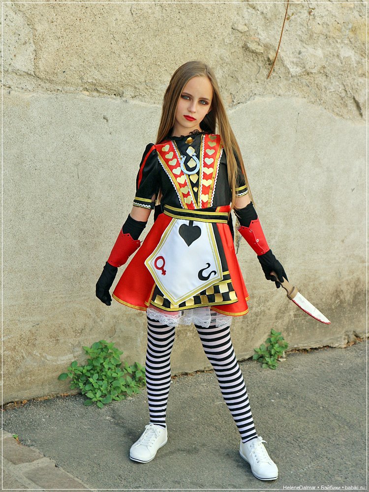 Потом по компьютерной игрушке про Алису (там Алиса мочит монстров, кишки-кровища, очень всё нервное) я сделала ей костюм Алисы ( у них в школе каждый год костюмированные карнавалы)