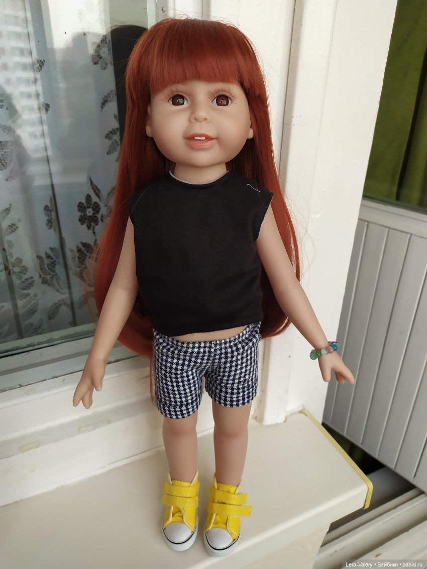 Здравствуйте! Вот такое улыбачее, 45см., виниловое, рыжее, паричковое чудо. Носилась с ней по дому примеряя одежки и обувь, а семейство посмеивалось. Одежки подошли от Готц и Эсны. Она и смотрится с ними гармонично.:) Надо имя придумать, буду рада идеям!