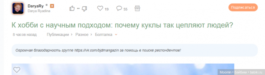 тема про коллекционирование шарнирных кукол типа БЖД, если я верно понимаю по тексту. Ну так… не там инфу искали. На тематическом форуме вам её без запроса выдали бы. Уже имеющуюся. Погуглите «опрос зачем вам кукла». Там больше 15 человек наберется) А ещё можно книжки умные почитать, статейки какие по психологии, тоже даст много больше, чем ответы 15 человек из вк. Бесплатно и без обмена на рекламу ;)
