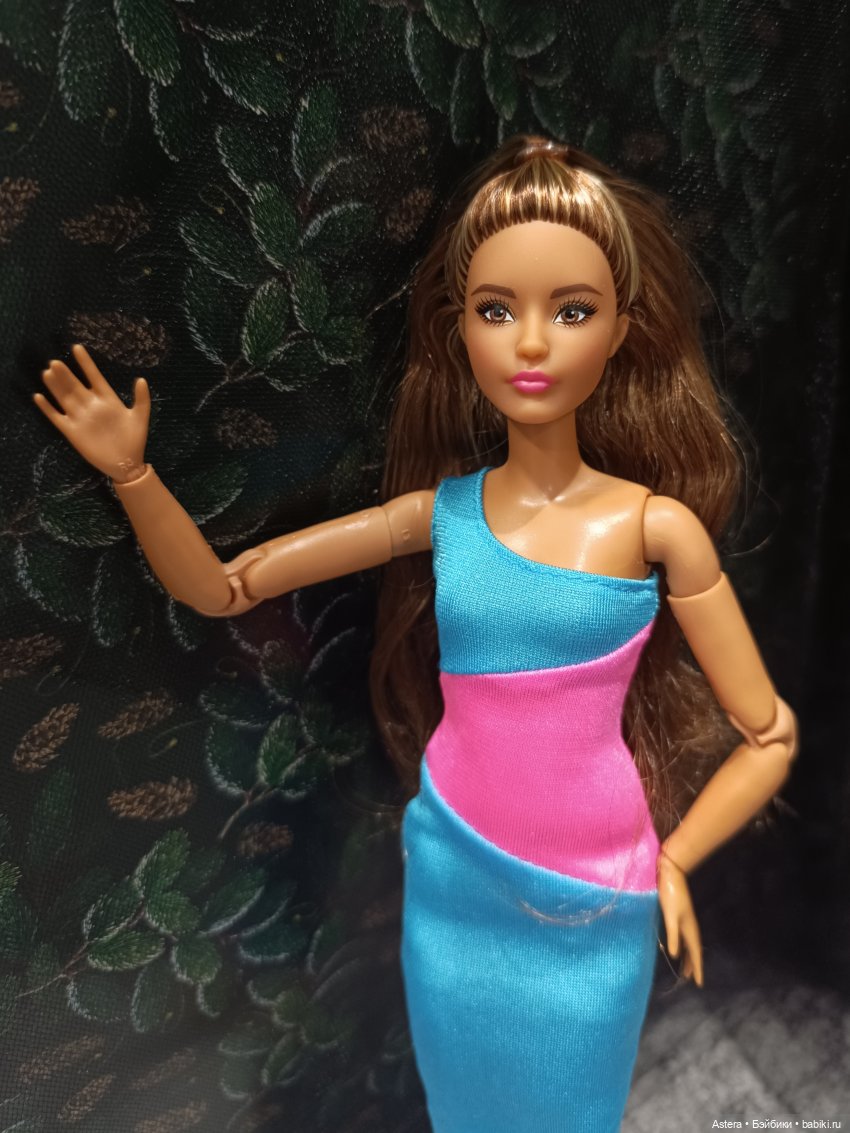 .Первая Барби выглядела как взрослая женщина, с длинным хвостом, темными волосами и ярким макияжем, одетая в черно-белый купальник.