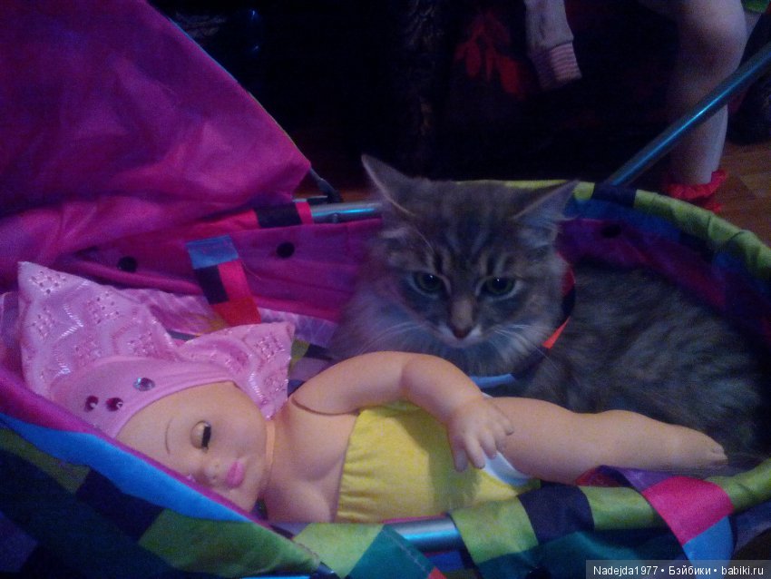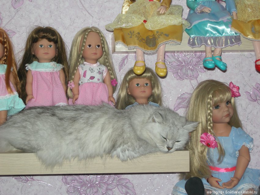 Это Ксюша, наша кошка. Ну очень любит компанию кукол!