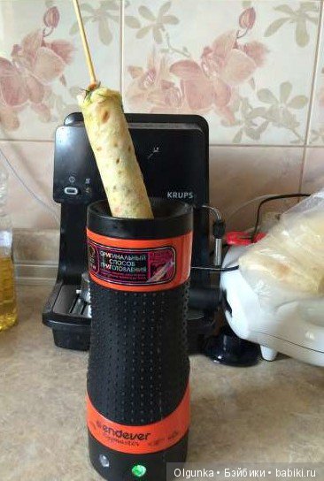 И ещё на алиэкспресс заказывала вот такую игрушку, за 500 руб! И доставили прям домой! Это вертикальный гриль-яйцеварка.На работе очень выручает, в обед.На шпажку деревянную (в наборе есть несколько штук)нанизываю любую начинку, сыр, или пол сосиски, можно и без начинки.Вливаешь в этот стаканчик яйцо, оно запекается и само вылазит из агрегата! У кого дети, так это вообще восторг! К этому девайсу даже прикладывается книжка на русском языке с рецептами.На фото, это я испытывала приборчик как только получила, делала в лаваше яйцо с колбасой и зеленью)