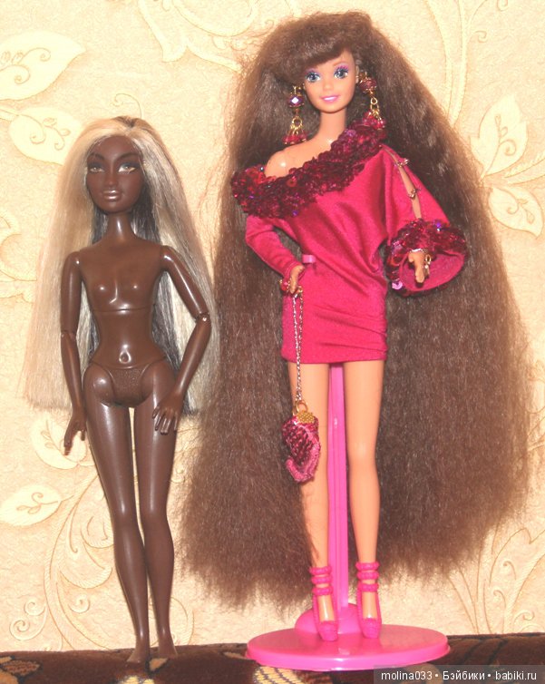 Следующая кукла – на мой взгяд если не самая, но одна из самых странных кукол в моем доме. Приехала она в лоте с Барби, но она и фигурой и головой и вообще всем от Барби отличается. На спине написано «Маттел». Похоже и Маттел время от времени идут на очень странные эксперименты…. Люди, если кто знает, что это за выпуск и как он назывался, подскажите, прошу, хочется посмотреть на ее более белых сестер. На следующей фотографии – она по сравнению с обычной Барби: