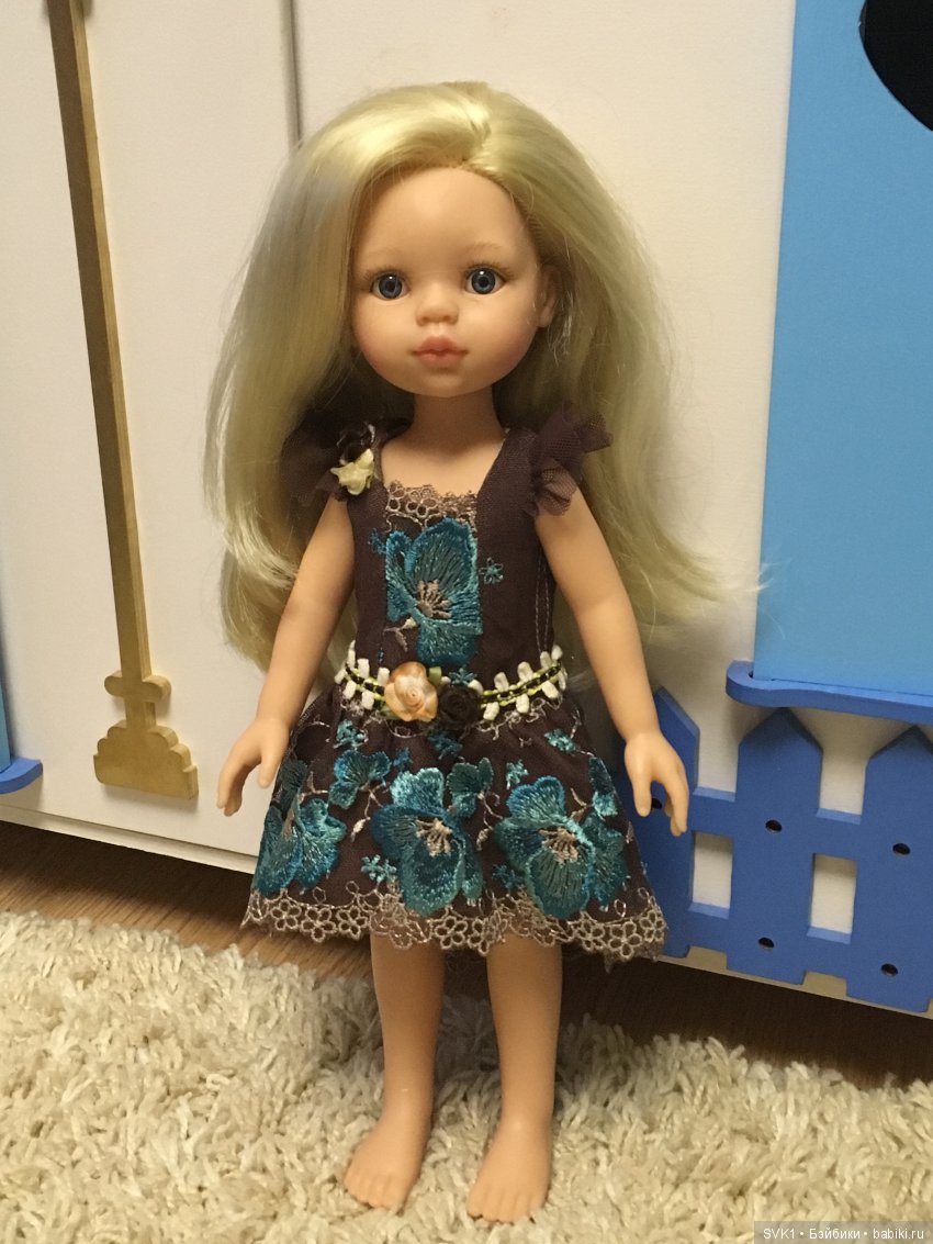 Хотя я вот о чем задумалась, каждый же под творчеством понимает разное. Ну допустим сшить постельное белье куклам для меня не творчество, я спокойно сяду за машинку и сошью и колготок из носков тоже целую кучу могу наделать. Это я к чему, все это не долго и не сложно, конечно на это у меня время есть, а вот сшить кукле платье или костюм, с этим сложнее. Во первых нужна выкройка, пока куклу обмотаешь, пока разрежешь, на бумагу перенесёшь пару часов пройдёт. Потом ткань, её нужно купить и не простую, фурнитуру, тесёмочки и т.д… Ну может быть это я такая медленная, но платье у меня получилось сшить за 5 часов, плюс 2 часа с выкройкой возилась. Вот оно