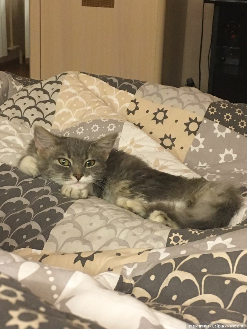 А он сейчас спит и ест. Я прихожу к бабушке, помогаю с едой, пеленками, он сразу ко мне бежит, ласкается. Хороший, добрый кот. Со всеми ладит, никого не кусает.