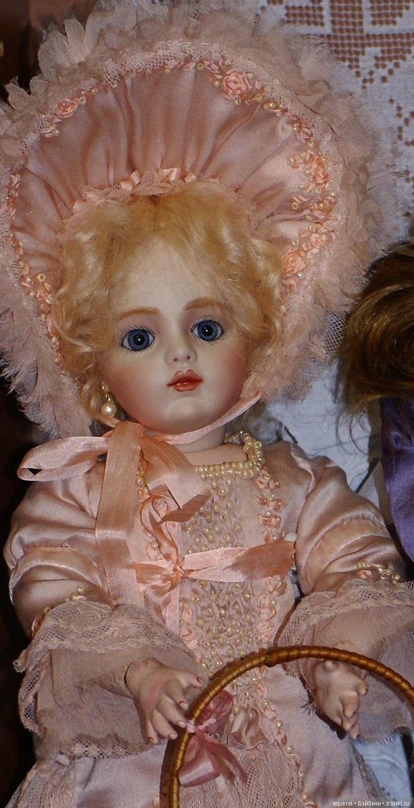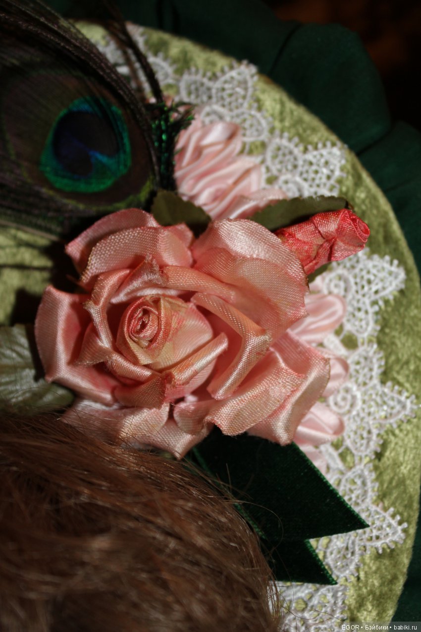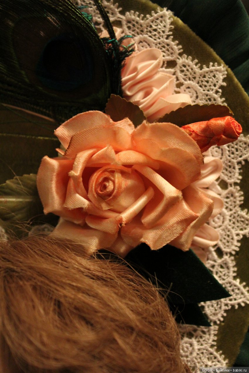 Третью Брю, самую большую, я купил тоже на ЯМе, но только голову. Тело я подобрал здесь, парик и туфли тоже. Туфельки украсил розовой тесьмой, розочками. Весь наряд сшил сам. Под платьем бельё и юбка с каркасом из обручей. Жакет из антикварного, шёлкового бархата, боннет тоже. Много кружева, кружевных элементов, шёлковой ленты. Серьги и колье из лабрадорита. Перья павлина и антикварная роза из натурального шёлка. Мейк тоже от Дарьи.