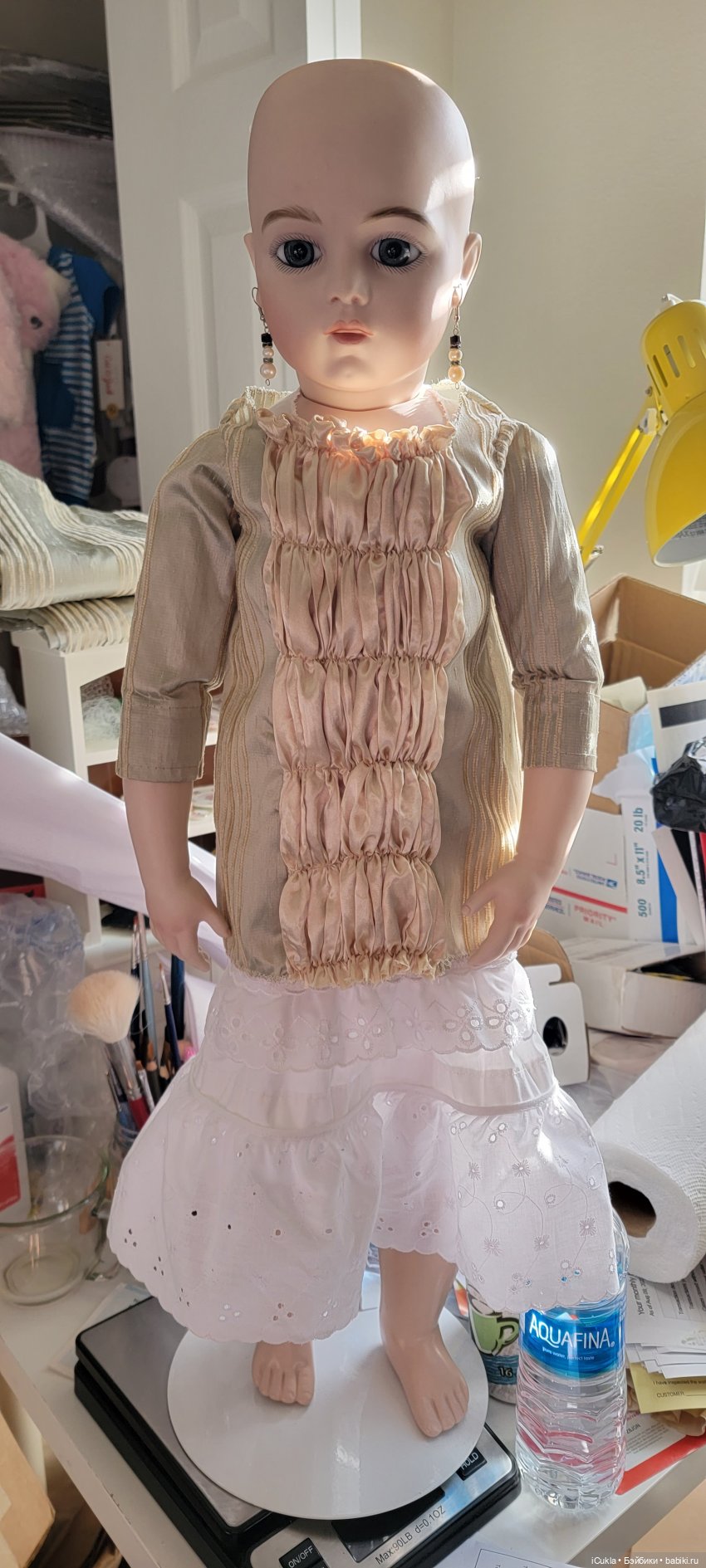 Я к вам опять со своей репкой Брю 28".В прошлой публикации я сняла ее такой, какая она приехала ко мне. Выяснить ее автора так и не удалось. Я писала всем известным художникам и никто из них не делал эту куклу. Так что это пока-неизвестных кистей репка:))Хотелось приодеть красотку.Целую неделю смотрела что можно купить готовое, но… цены… и ничего классного.Решилась сшить.Выкройку мастерила сама-по кукле.Ткани-штора и шелковая простыня из секонд-хэнда.Кружева-антикварные из сундука.Брошь тоже антикварная и даже серебряная, настоящая Камея.Туфельки-антикварные из закромов.Парик-который вы посоветовали.
