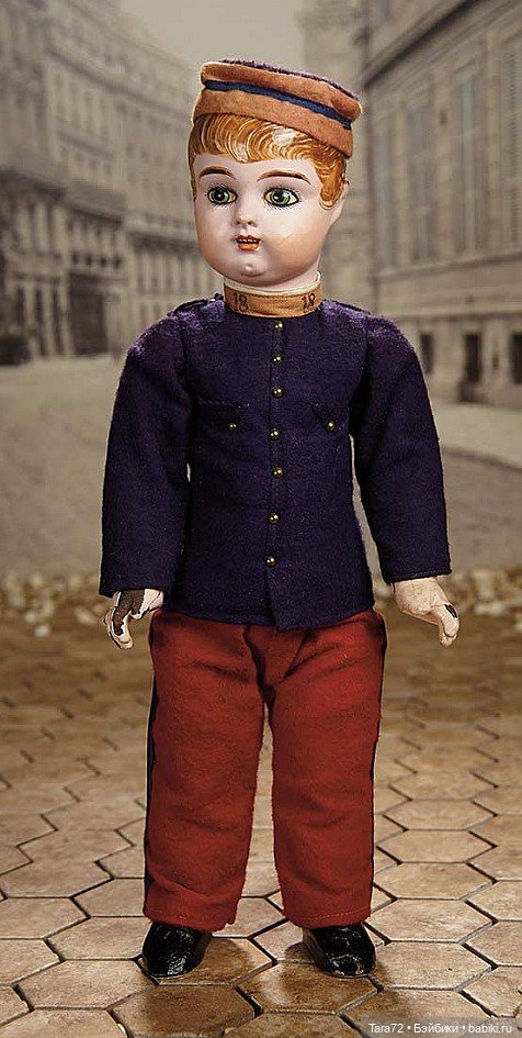 14 1/2" (37 см) Цельная куполообразная голова из папье-маше, нарисованные каштановые волосы с завитыми локонами вокруг лба, нарисованные черты лица, голубые глаза, очень толстая черная подводка для глаз, нарисованные ресницы, нарисованные брови с декоративной глазурью, акцентированные ноздри, открытый рот с четырьмя скульптурными зубами, тело из папье-маше с сочленениями на плечах и бедрах. Состояние: в целом отличное. Комментарии: Pintel и Godchaux, около 1890 г. Ценные характеристики: выдающаяся детализация нарисованных глаз и волос, прекрасная оригинальная отделка по всей поверхности, одета в оригинальную темно-синюю и красную фетровую униформу и соответствующую пристегивающуюся шапочку.