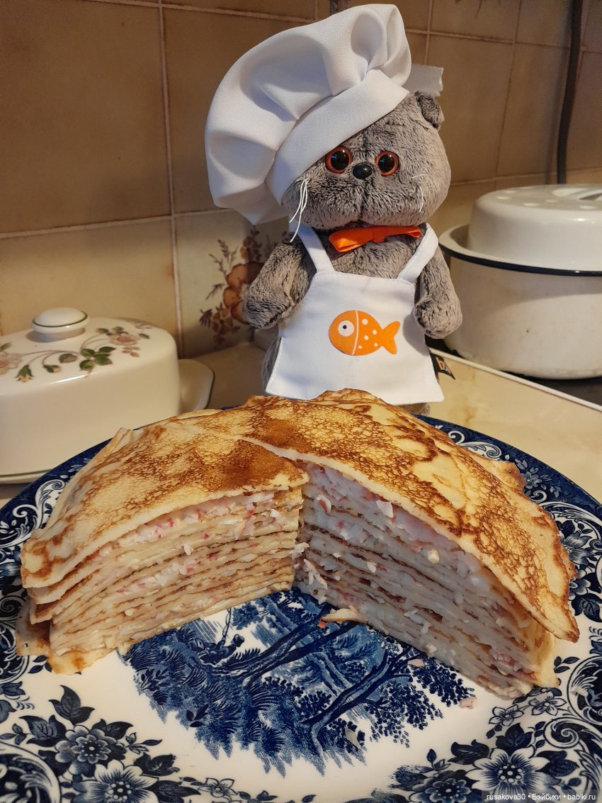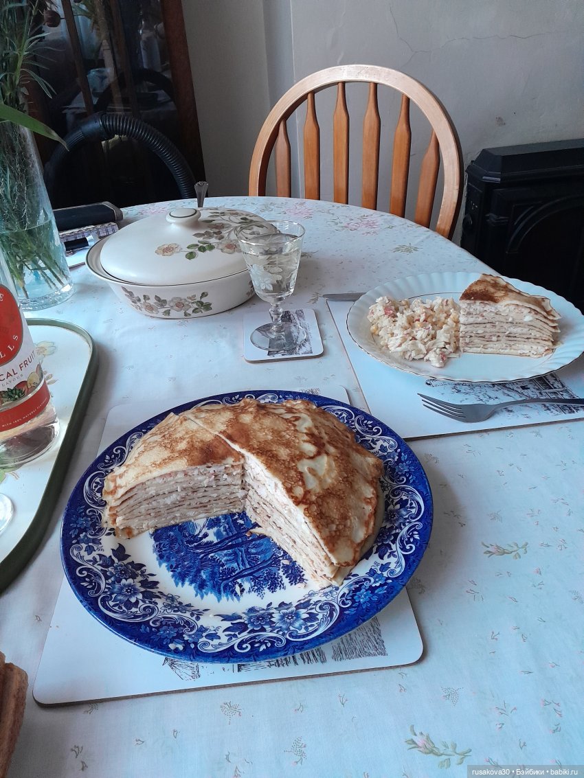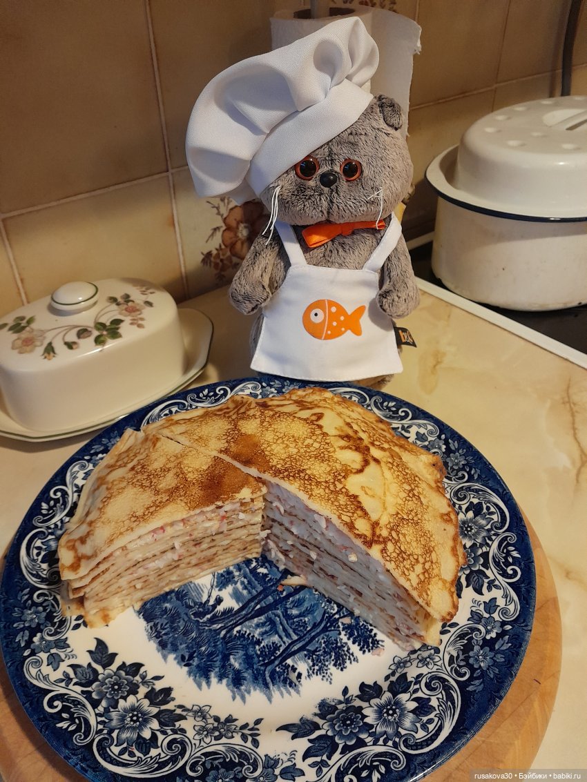 В прошлом году мы такой торт делали с печенкой, а в этом году с крабовыми палочками и вареными яйцами.