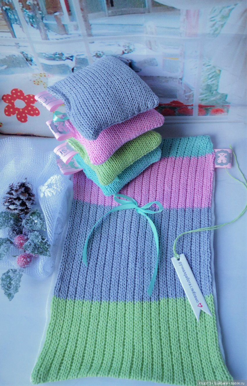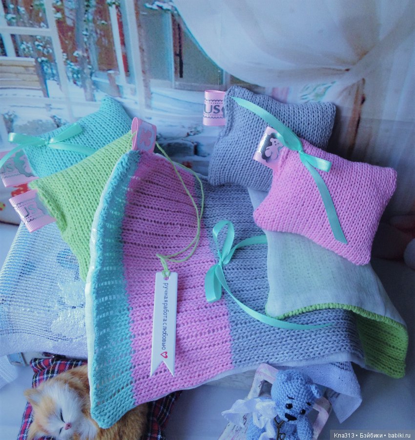 Плед вязаный. с изнанки пришит белый лен. Куклам тоже должно быть уютно и приятно.