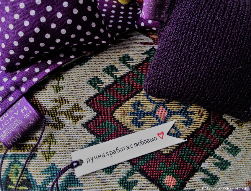 В этом комплекте плед из мягкого гобелена и фиолетового хлопка в горошек. Подушки 2 из хлопка, 2 вязаные.