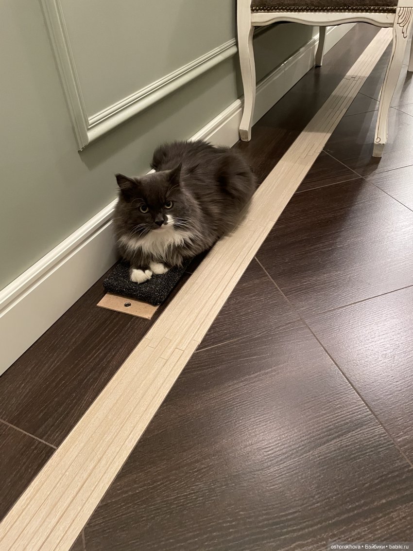 Пока жили на даче, мы не отнимали у котика улицу, мебель вся живёхонькая — коготки точились об яблони)) А когда переехали в квартиру, он очень всех удивил — полюбил самую простую планку, даже на стену не успели закрепить, так и лежит теперь в прихожей. Об нее он точит когти, на ней он сидит, на ней он лежит, на ней он ездит на пузе по всему коридору, отталкиваясь задними лапами, в припадках бешенного игрательства))