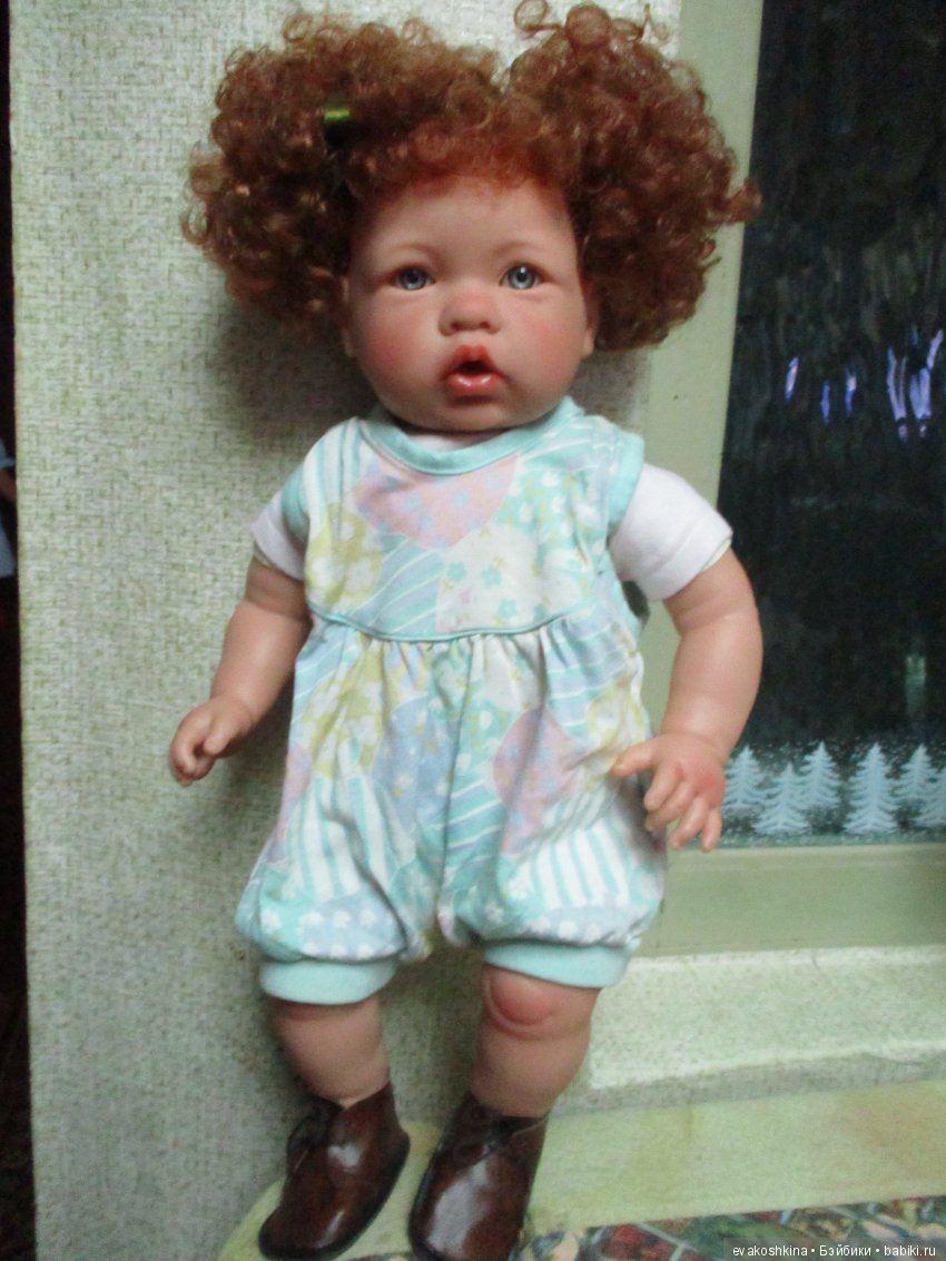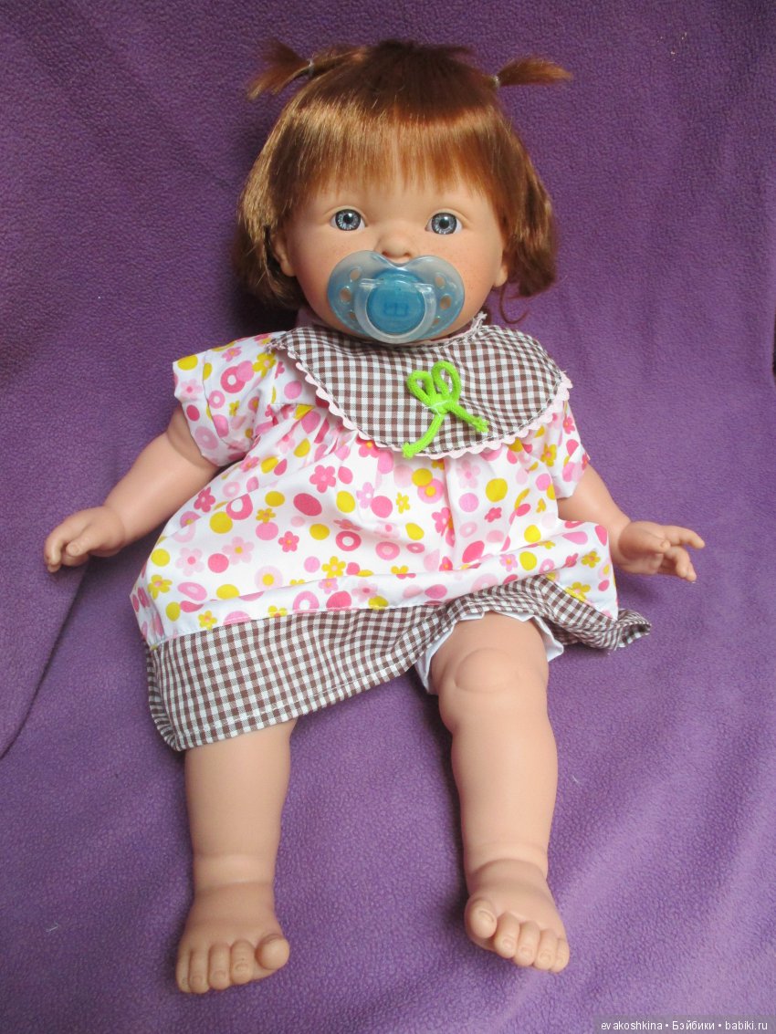 Кратко о пупсешке. Девочка заявлена 41 см, не мерила, крупненькая. Со звуковым устройством, смеется, говорит мама и папа, причем так же, как моя мягкая маленькая вестида де азул (у той вместо смеха плач). Хорошо набита, звуковое внутри не выпирает, оно зашито и под набивкой. Волосики прошиты очень часто, коротенькие, едва собираются в хвостики, внизу длиннее и завиты. Прическа очень нравится, как у малышки, и лежат аккуратно. Ресничек нет. Одежда милая, хорошо сшита, края ткани не обработаны, не осыпаются, хлопок. Продается в целлофановом мешке. Что важно, в ротике нет дырки. Почему обращаю внимание на это, другой молд куколки (личико хмурое немного) имеет это отверстие во рту, оно на фото как черная дырка выглядит, непонятно, для чего, кукла мягкая, без функций.