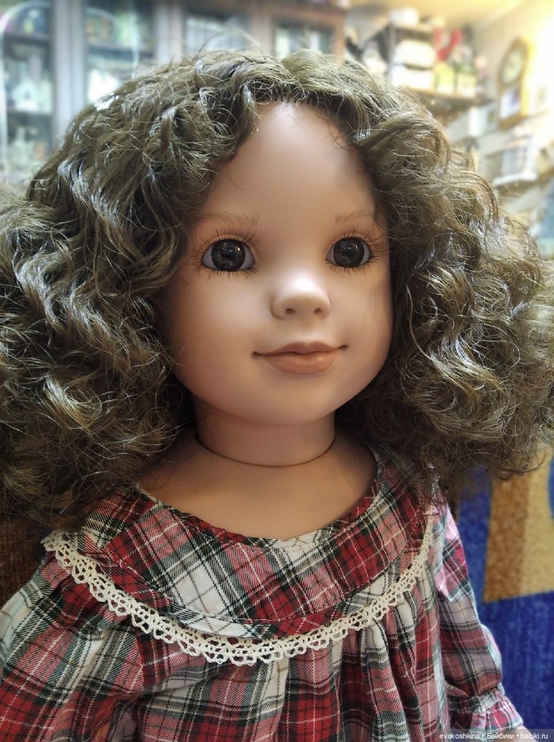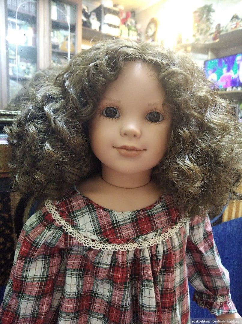 Вот так выглядит её тело. Твёрдая пластина на груди позволяет носить небольшое декольте. Ручки и ножки приятные на ощупь, детально проработанные. Голова поворотная, серо-голубые глаза и нежные веснушки. Изначальный вид волос меня не устроил и я их расчесала, а затем разобрала на маленькие прядки и с помощью воды и пальцев завила по форме.