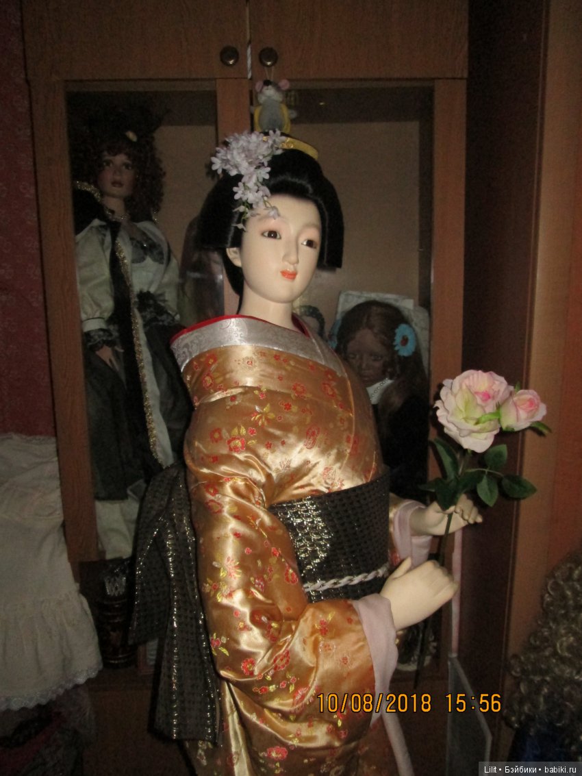 Доброго времени суток, дорогие бейбиковцы! Хочу показать Вам чудо, которое поселилось у меня недавно. Буквально приехала с деревни и тут вдруг появилась она в продаже, и у моей очень хорошей знакомой! А история началась ещё в 2009 году, когда я проходила мимо витрины антикварного магазина и там впервые увидела большую гейшу, только она была в чёрном кимоно. И я тогда и подумать не могла, что когда-нибудь такая же поселится у меня)). Просто очарованная прошла мимо и не забыла сфотографироваться на память). Вот то фото, там на заднем фоне она:
