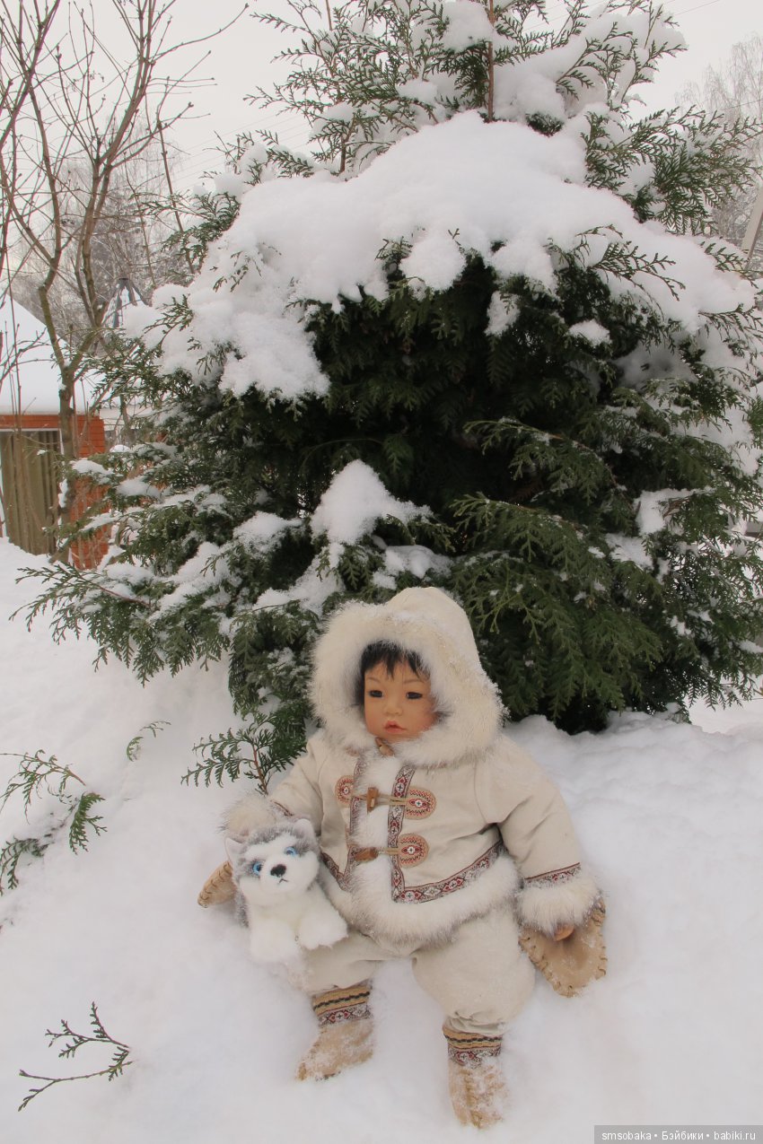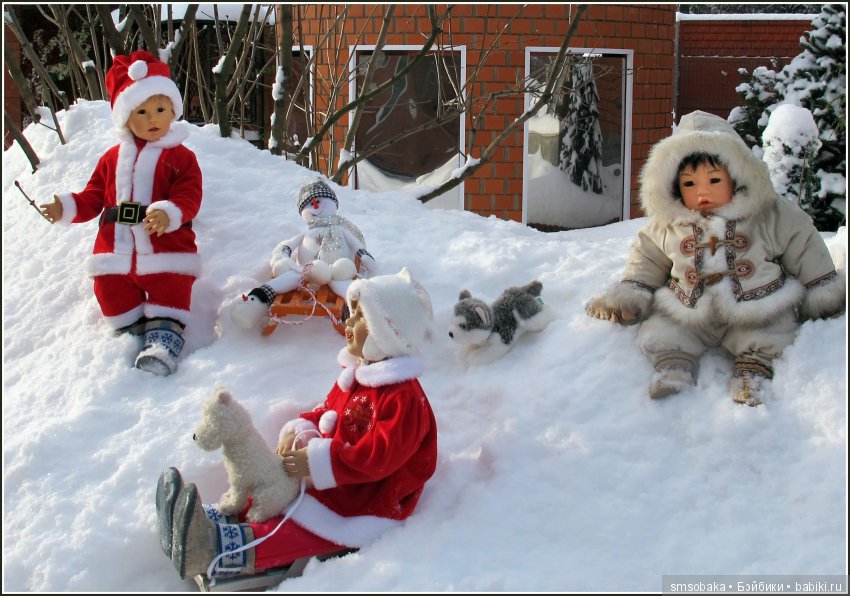 Очень понравилось, как Ваши кукло-дети играют! совершенно живые! И хаски тоже! как будто, ринулся за палочкой, которую мальчик Скилле собирается бросить:) А на переднем плане — словно эпизод из мультика «Варежка»:) Помните, там был пёс, которого девочка на санках возила? Только, у Вас девочка и пёс вместе на санках катаются:)