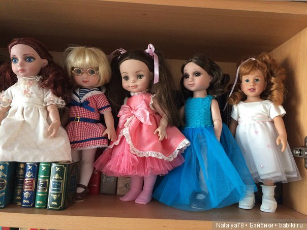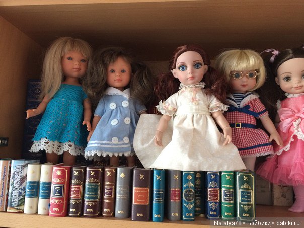 Куклы ростом 26 см живут на полочке в книжном шкафу