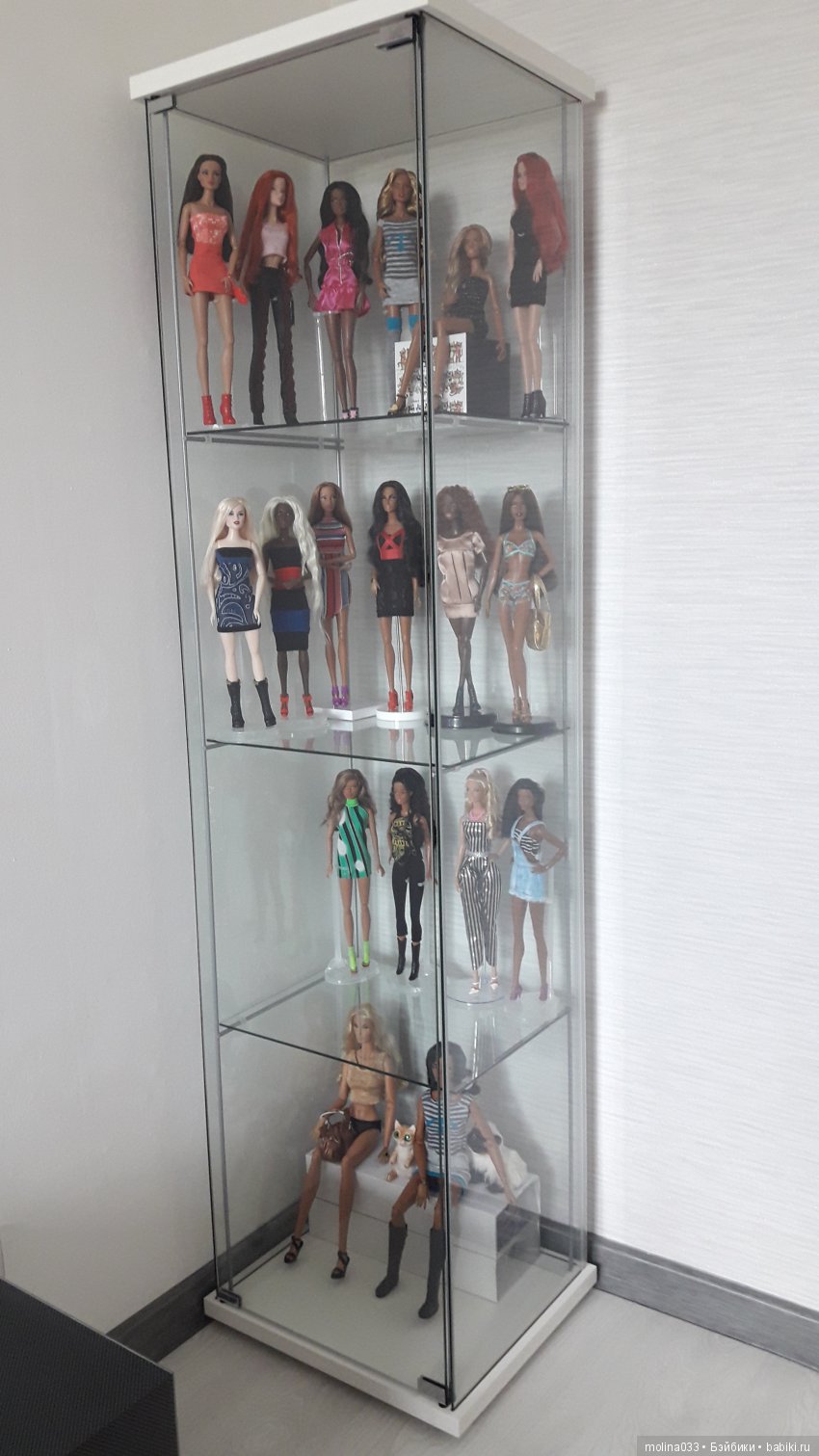Несмотря на множество опасений перед покупкой (не будет ли «грузно», не превратится ли комната в вагон из-за визуального сужения, не будет ли она выглядеть как магазин игрушек, не будут ли некрасиво смотреться рядом куклы разного размера, не создаст ли визуальный шум расположение полок на разных уровнях), я решила построить стенку из 10 самых узких так называемых книжных шкафов IKEA серии Billy. Для хранения книг я их не использовала ни дня, толстые книжные полки сразу были заменены на стеклянные (благо, также продаются в IKEA). Позже, когда и эти шкафы перестали вмещать всю коллекцию, была куплена витрина Milsbo той же горячо любимой фирмы. Результат на фото.