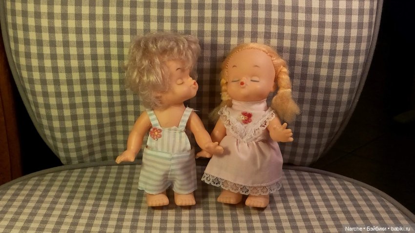 Свадьба в детском саду. Ох уж эти современные девочки. Долго поцелуя ждать не станут. Девочка закрыла глазки и вытянула губки для поцелуя. Мальчик любуется красавицей-невестой. На его личике читается любовь и нежность. Девочка одета в красивое кружевное платье и фату, понтолончики и кружевные колготки, на ножках заветные ботиночки. Мальчик одет в рубашку, пиджак, торжественную бабочку, шортики и белые колготки. На ногах туфельки. Шнурки мы еще завязывать не умеем. Высота мальчика от мокушки до коленочек 30 см.