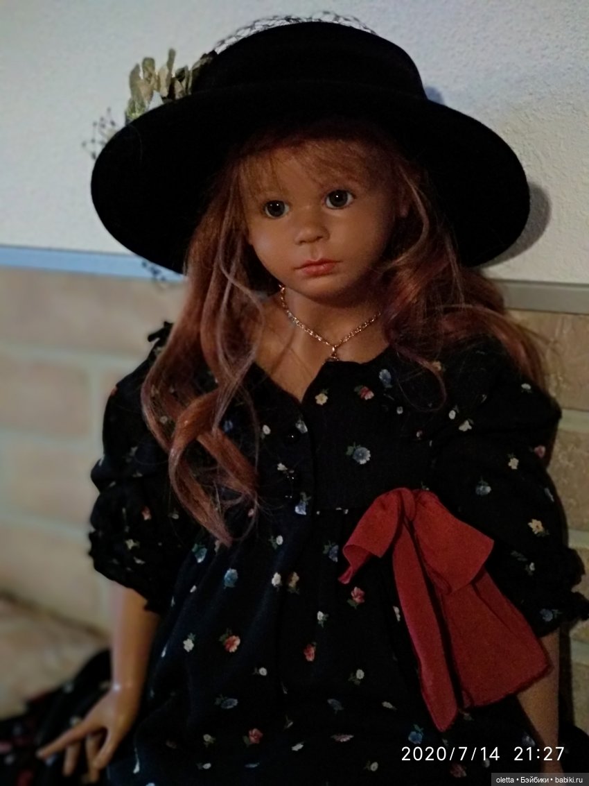 Девочка задумана сидячей, но с помощью подставки может стоять.Очень нежная, немного задумчивая, мечтающая девочка с голубыми глазками(стекло), с белокурой, густой гривой натуральных волос, потрясающая лепка ручек, ножек, утончённого личика…