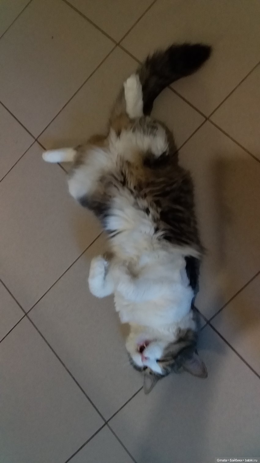 А вот откуда хвост такой, я не знаю. Дымку на улице нашли, брошенка. Происхождение Дымки для нас загадка.