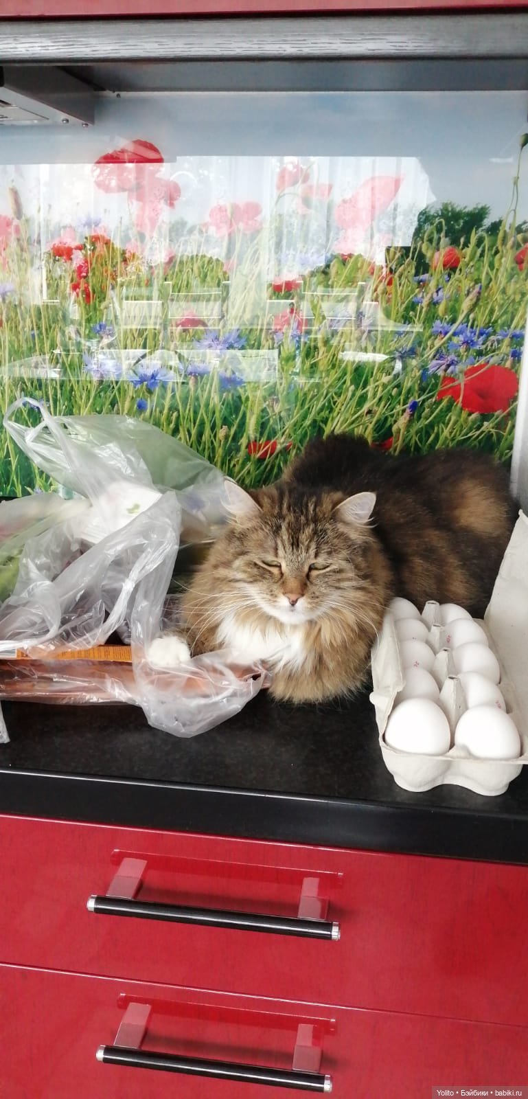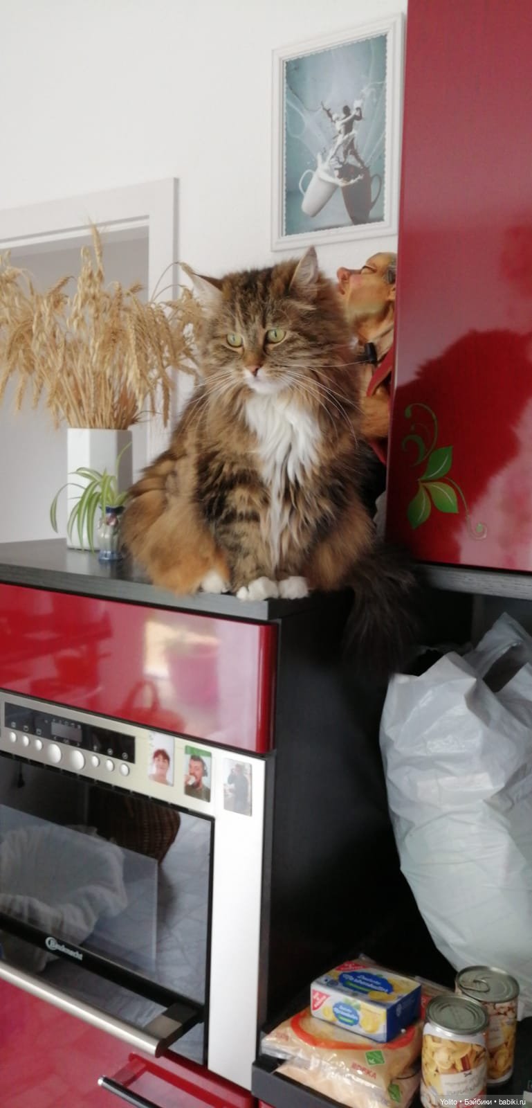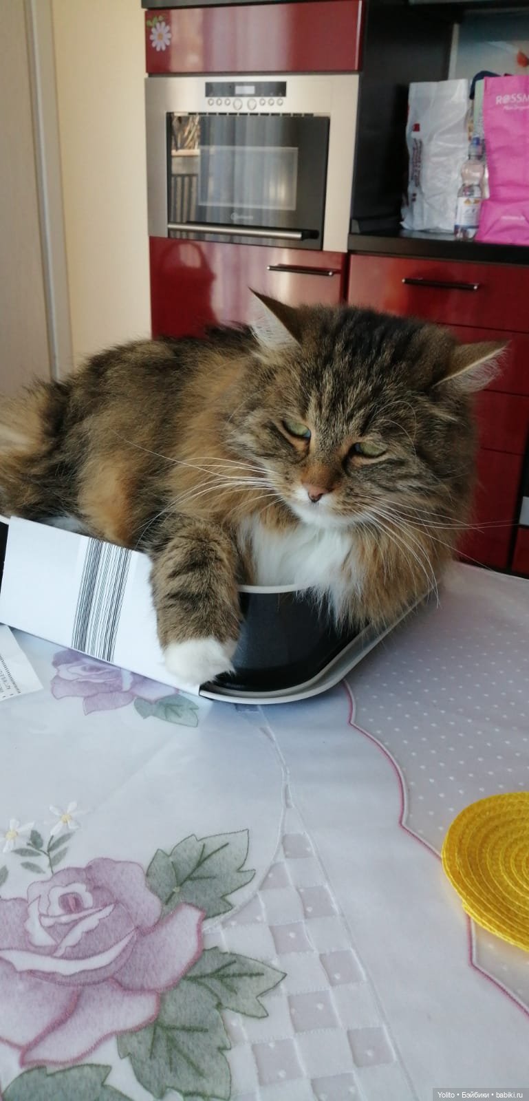 Лена, ну нааадо же! Хозяюшка какая! Получается, что её любимое местечко рядом с продуктами? Хитрааа… Но это очень правильно с её стороны держать сумки под контролем! Чтобы ничего мимо не проскочило ))