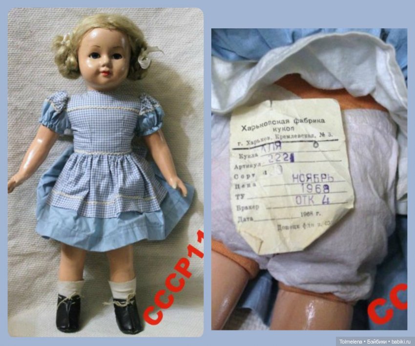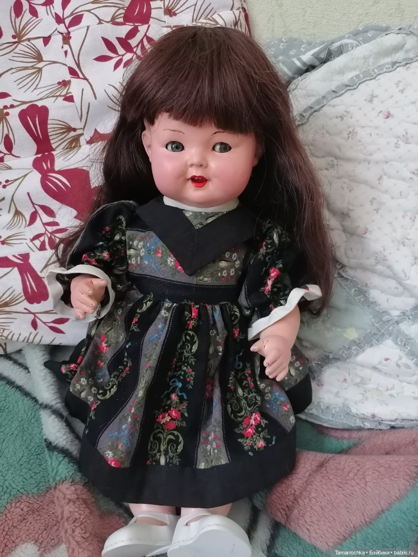 5. Завершает эту часть кукла Аля Харьковской фабрики СССР, конец 1950- начало 1960 годов. Голова и конечности прессопилочные, тело текстильное набивное, волосы – родной шерстяной парик, есть пищик картонный с тряпочкой), глазки спящие. Ростик у этой отличницы 48 см.