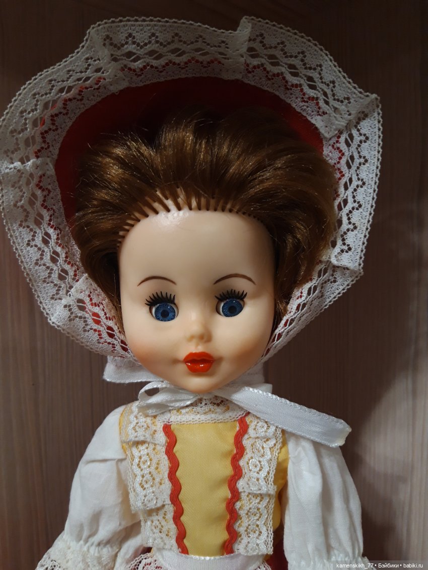 7. Марина Московского завода Огонек (Россия), 45 см ростом, имеет уже виниловую голову и ручки, пластмассовое тело, прошитые волосы и спящие глаза. Выпускалась в различных образах: повар, красная шапочка, художник, Мальвина, в национальных костюмах, ну и просто девочкой)