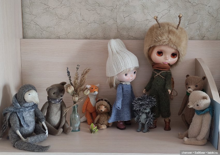 И очень интересно как маленькие среди больших куколок разместились. Это интуитивно Вы так скомпоновали полки или продумывали, подбирали группы?
