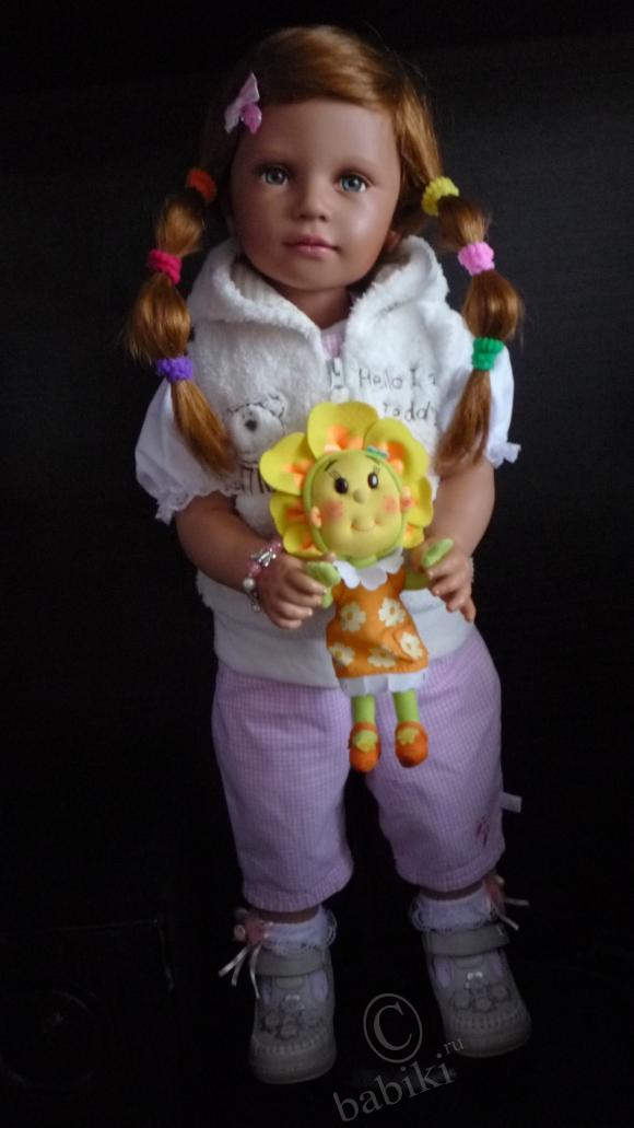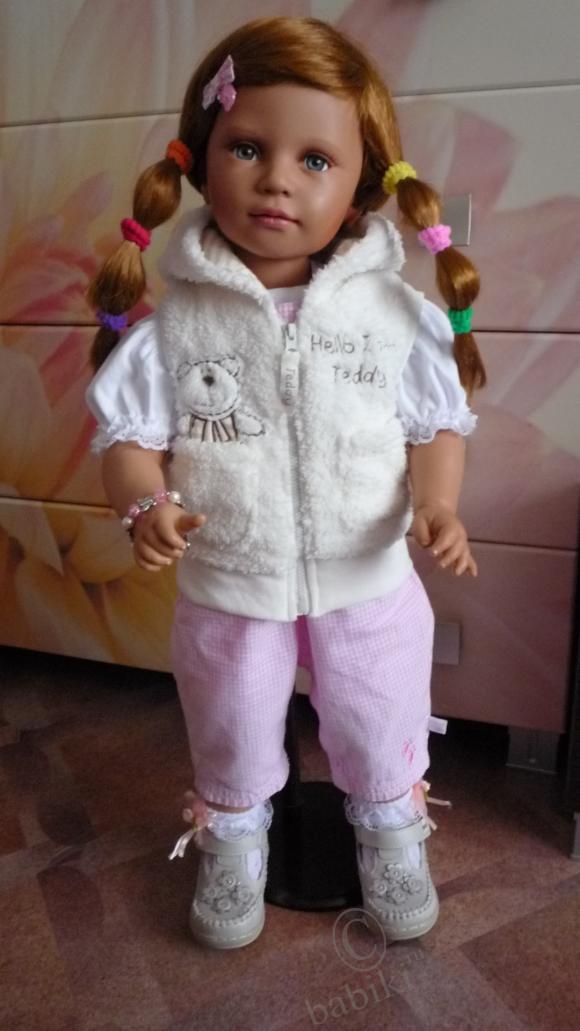 она пришла с такими косичками, но я не устояла и распустила косы… Розочку с фартука убрала, т.к. на шею одела ленточку, мне не нравится как шея встречается с плечами, вместе с розочкой переборчик