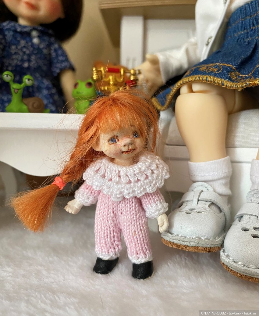 А вот эта малышка росточком 6.5 см автор Маринаmonna . Я ей только сделала рыжий паричок, стала по ярче, а костюмчик связала ИринаTalichanka , за что мы ей очень благодарны.