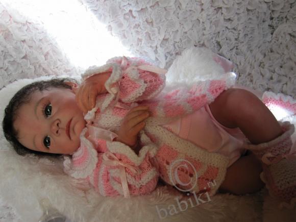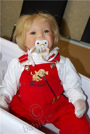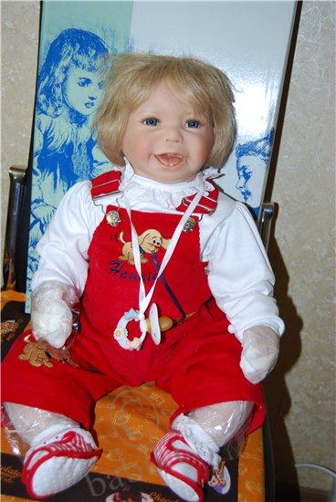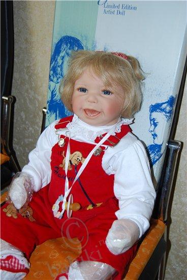 Сегодня пошла посылать бандероль, и на всякий случай спросила, нет ли мне чего из Германии. Какого же было изумление, когда мне вынесли большую коробку. Что рассказывать, все знают, как хватаешь и бежишь рысью домой с одной мыслью, скорее, открыть, достать, прижать))) Но еще больше я удивилась, когда обнаружилось, что это моя потерянная посылка, которую уже и не ждала, продавец пропал, не отвечал, номер у меня не было… а тут! Ура! Это Ханни! Девочка превзошла мои ожидания, она не только очаровательна с этой улыбкой, маленькими зубками, прелестным костюмчиком, да еще игрушка-волчок, и браслетик с именем, а когда берешь ее в руки… это потрясающее чувство, она будто обнимает тебя, прижимается и шепчет на ушко пока по-немецки — Мутти! Но научим, и по-русски будет шпрехать! В общем, чудо, а не ребенок! Скажу по секрету, я таааак хотела Ханни, и когда продавец пропал, я заказала еще двух на всякий случай, так что кому-то повезет приобрести это счастье. Ну, смотрите, правда, пока еще лохматые, с дороги же