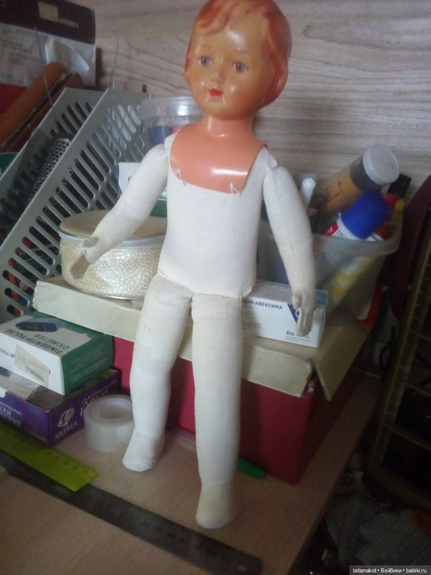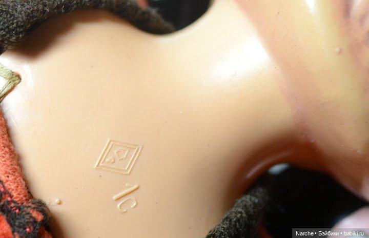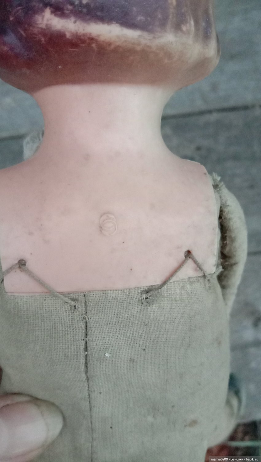 Целлулоидная головка знакомая. Я порылась, на форуме Доллпланет есть тема- Куклы- бюстики, там, к счастью сохранилось фото куклы с таким же молдом, и на ней есть маркировка.