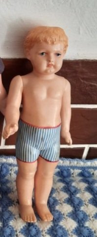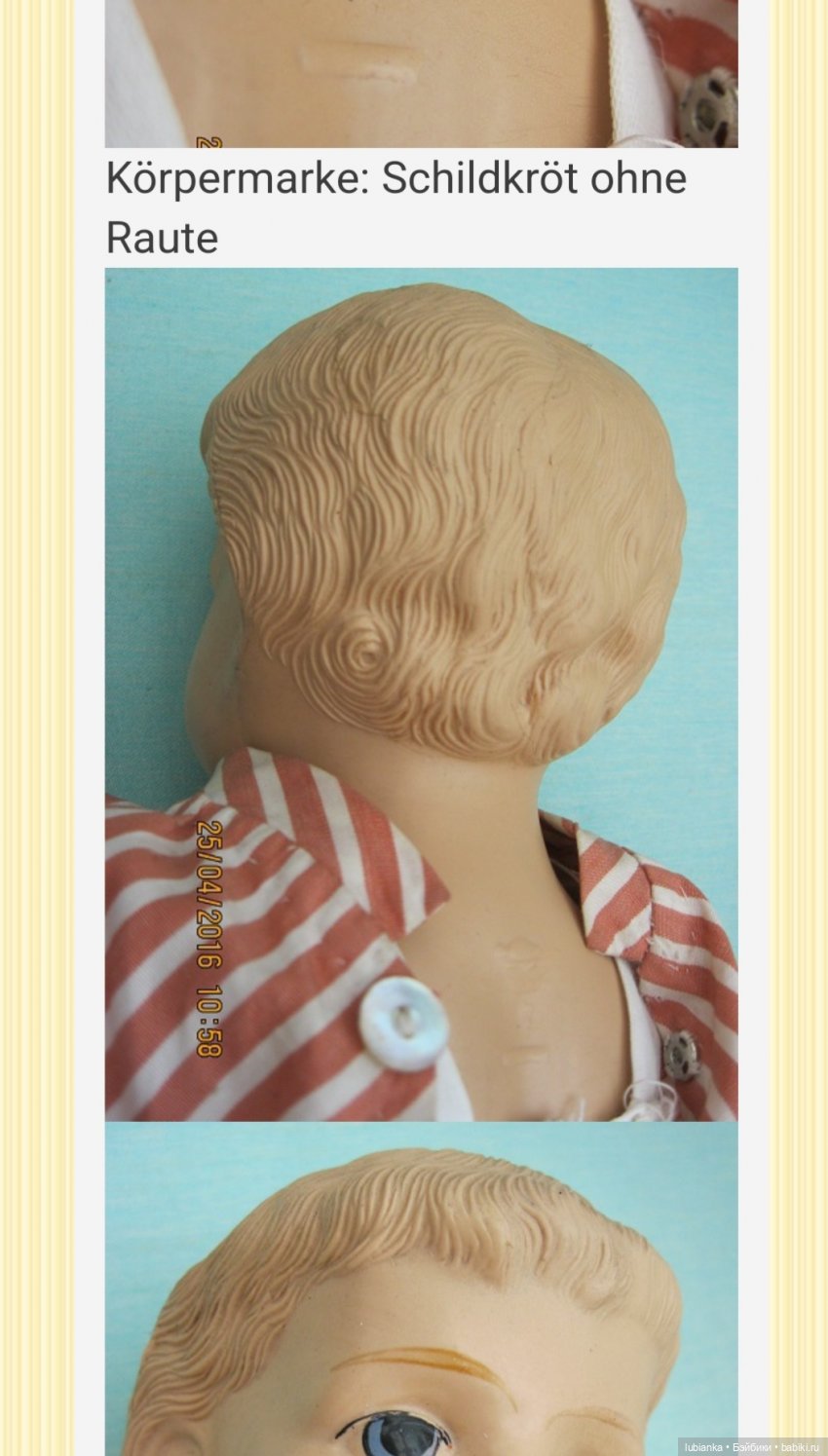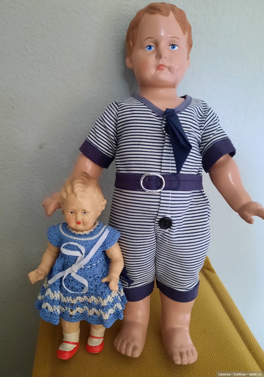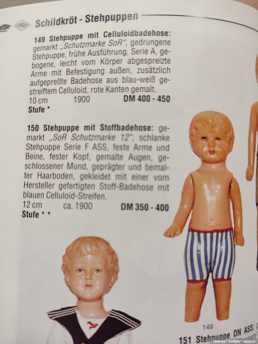 Напомню только, что с 1980г.эта фирма стала производить реплики основных кукол(их было 5), а с 1984г. куклы производиться стали в Рауэнштайне, фирма назвалась «Schildkrot Puppen GmbH».На моём куклёныше стоит серийный номер 0914.Ростом он 32см.Материал средний (на мою делитантскую «ощупь»))между тортулоном и целлулоидом.Их, со слов продавца, почему то называют«лягушки» и, с её же слов, продаются они голыми… но этот в шикарном костюме-мне повезло)))Реплики я, честно, не очень жалую… но тут никак не смогла устоять-покорил🤗😊