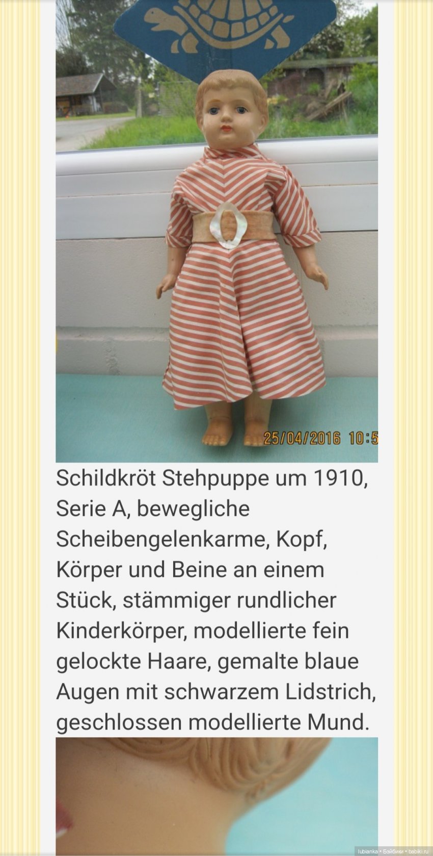 Я перевела. Стоящая кукла. Платье с цельнокроенным рукавом. Волосы молдировнные. Туловище цельнолитое. Рисованные голубые глаза с черным зрачком. Кукла 1910 года. Детский тип тела. Маркировка на теле: шилдкрот ( черепашка ) без ободки ( ромба ).