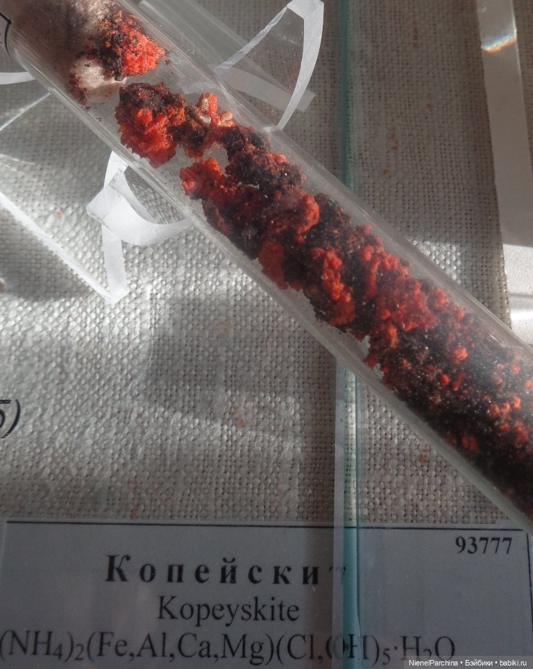 Копейскит — это отдельные кристаллы или их сростки, прозрачные или просвечивающие, яркого оранжево-красного цвета, очень хрупкие. Минерал встречается в виде рыхлых скоплений и корок в привершинных частях терриконов на глубине 5…20 см. Копейскит можно увидеть во многих музеях мира — например, в Париже, он имеется в минералогической коллекции Сорбонны.