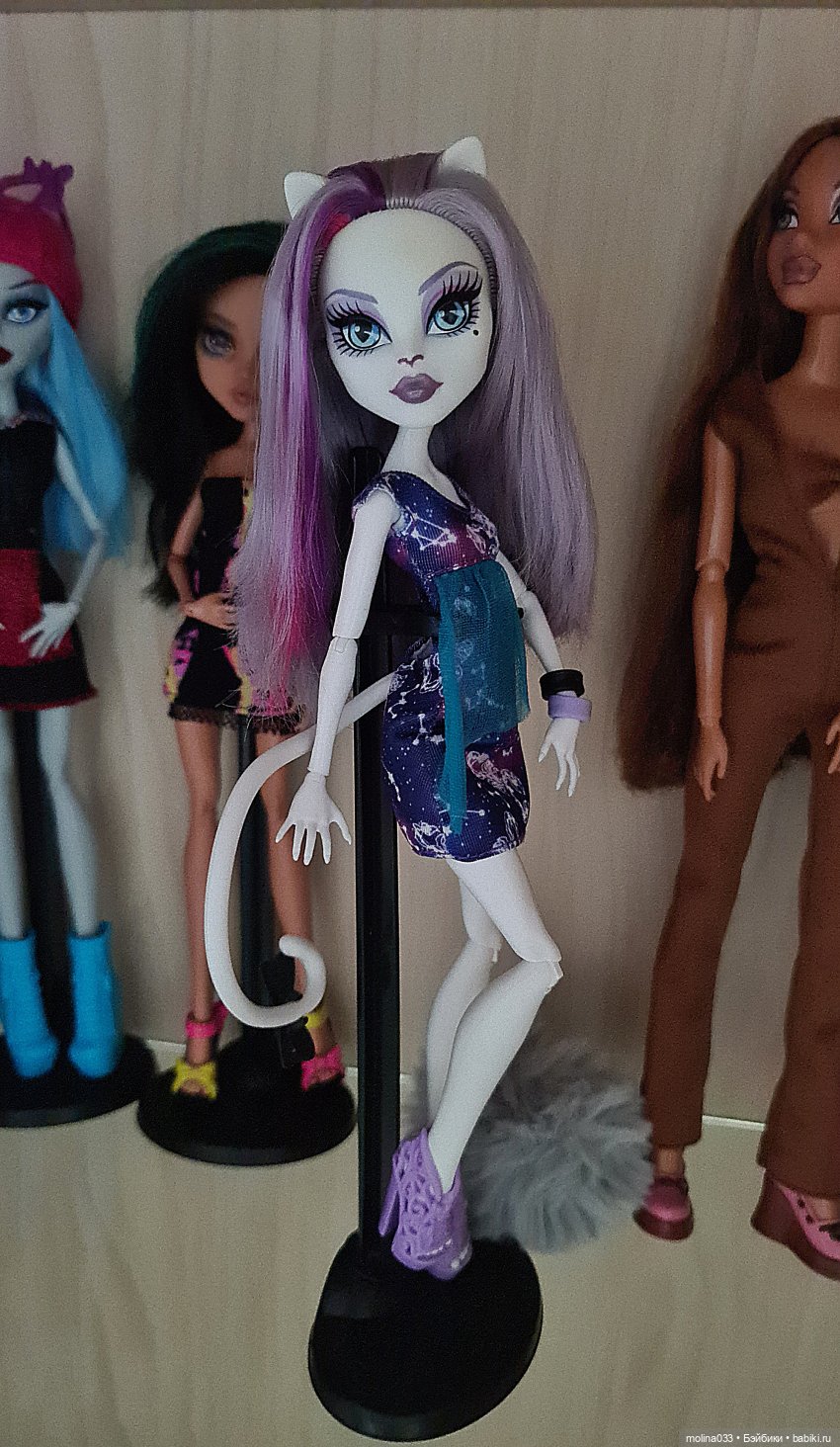 По своему происхождению это Катрин ДеМёв — Monster High New Scaremester Catrine DeMew. Кукла не новая, но в хорошем состоянии, и в полной комплектации. Самое главное — теперь у Катриши наконец-то есть хвост! Печально, что деградационные процессы не обошли и её, но дочери удалось успешно справиться с их последствиями.