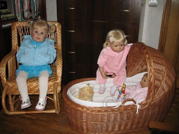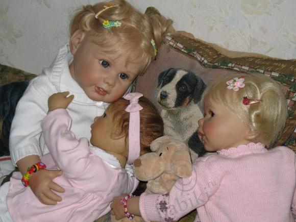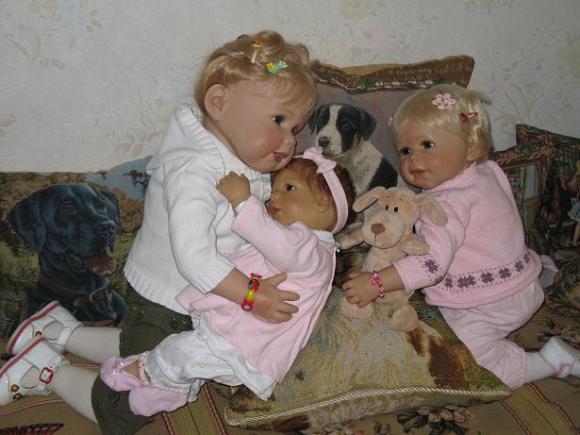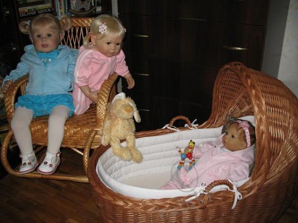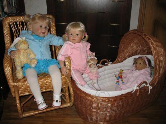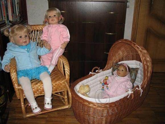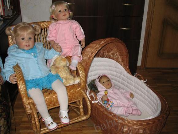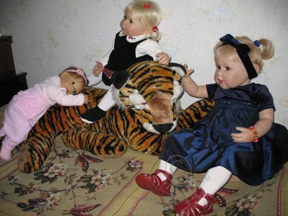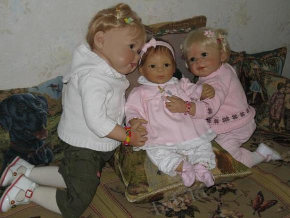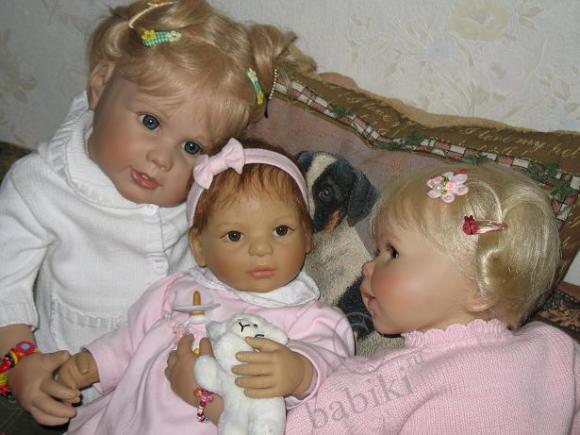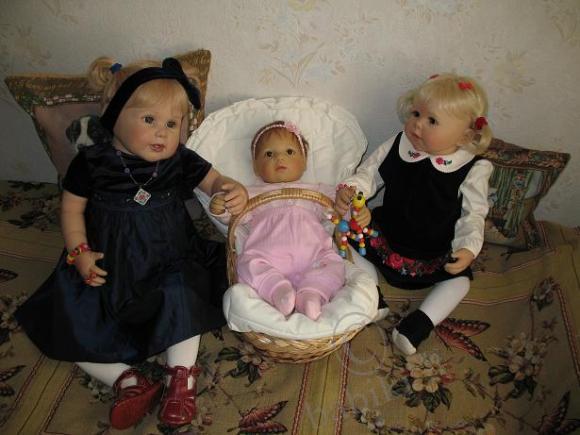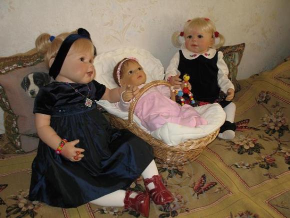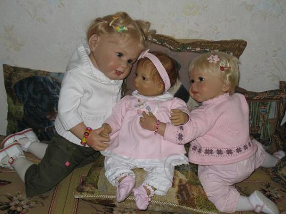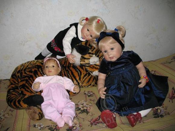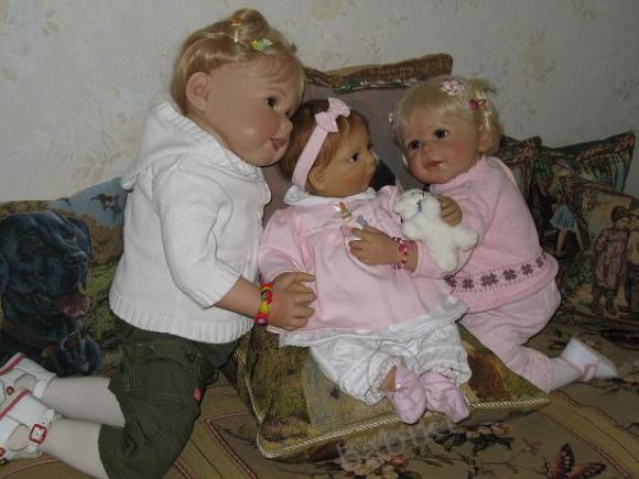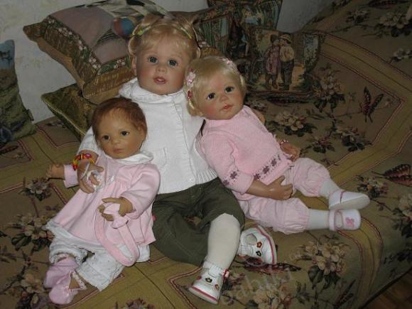 Куплены они все были в Москве, с рук, но выглядели как новые. Появлялись они у меня почти подряд, с небольшими временными промежутками. Самая большая (86 см) — кукла Nina от Monika Peter-Leicht, вторая — Maxima (60 см) того же автора, а самая маленькая Micсhi (50 см) от Регины Свиалковски. Из всех трёх малышек осталась только одна — Максима — многие видели мой отдельный топик о ней. Две другие находятся теперь у другой мамы (обе у одной). Больше всего жалею о самой большой кукле, но так тогда сложились обстоятельства, что пришлось её продать. Очень тяжело с ними расставаться и чувствуешь себя потом ужасно — как будто предал…