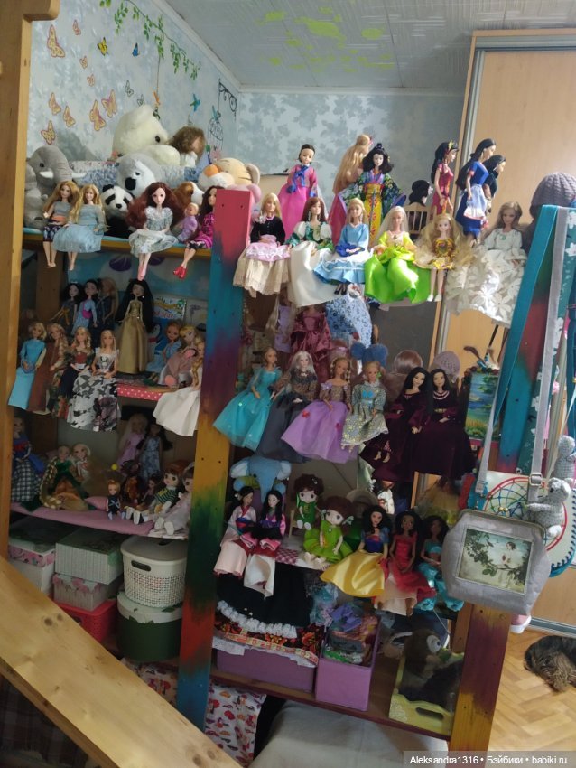 Коллекция кукол шикарная, все нарядные, ухоженные, кругом красивые картины… Забираю в избранное для любования! А кошечка как вальяжно лежит в обнимку с барби… наслаждается жизнью.