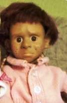 У мальчика в кепке при нажатии на живот-прищуривается один глазик.тогда таких куколок был большой выбор сразными выражениями лиц.Кто-то прищуривал глаз, кто-то открывал и закрывал рот.Очень жалею, что не купила еще девочку.А вот эти жители были куплены в разных секондах.