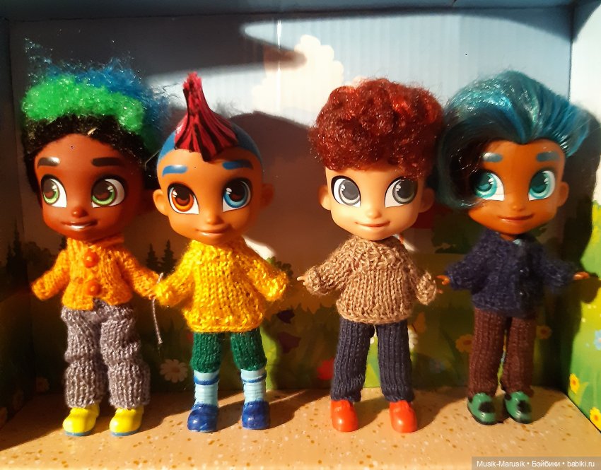У этих мальчиков молд наоборот — общий с девочками серии, но это узнаваемые персонажи в полном мальчиковом оформлении: прическа (если она молдированая — уже не перепутаешь, это не просто короткая девчоночья прическа) и аутфит (тоже частично с молдироваными деталями, не потерять).
