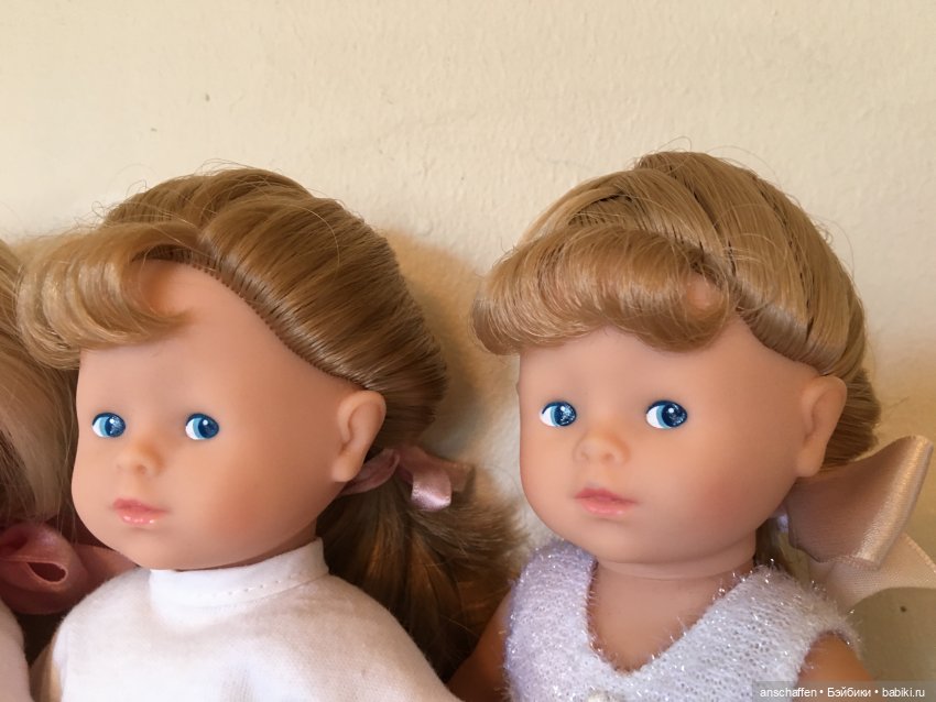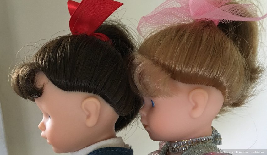 Для начала я отсекла варианты 98 года. Там и прическа более пепельно-блондинистая, и винил прозрачнее, и губки не того цвета, взгляните. Для примера — коробочные Ученица и Балерина.