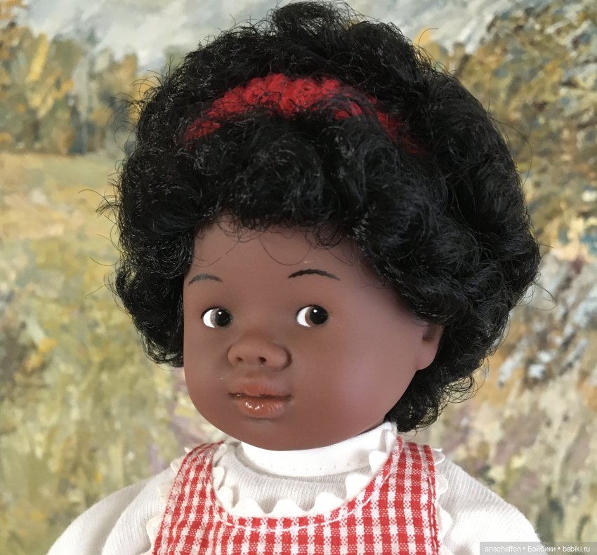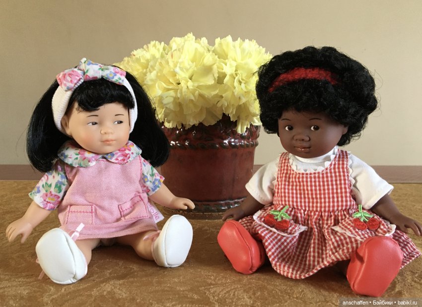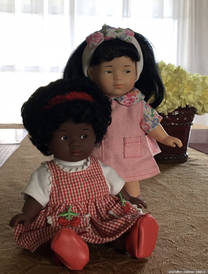 И мое кратенькое реноме: уж на что я не люблю этнических куколок, но эти две — прямо красотки! Действительно этнические, и не только из-за цвета. Носики с хорошо обозначенными крыльями и в самом деле другие, у европеидных куколок кончик носа острее. Волосы (не могу не сказать) — мечта: и азиатский блестящий «шлем» и африканские кудряшки (афро и так плотный, так еще и винил прокрашен чёрным; у азиатки не прокрашен). Тельце прекрасное, 2000 год — как раз то самое время, когда винил стал тёплым и «пухлым», так что эта африканочка из последних, думаю, будет отличаться от тех, что были в 90х. В общем, куколки — загляденье! Куплены они были на «подержать в руках, пощупать», но признаюсь, после этого «подержать» почти пожалела, что не являюсь любителем такого формата.